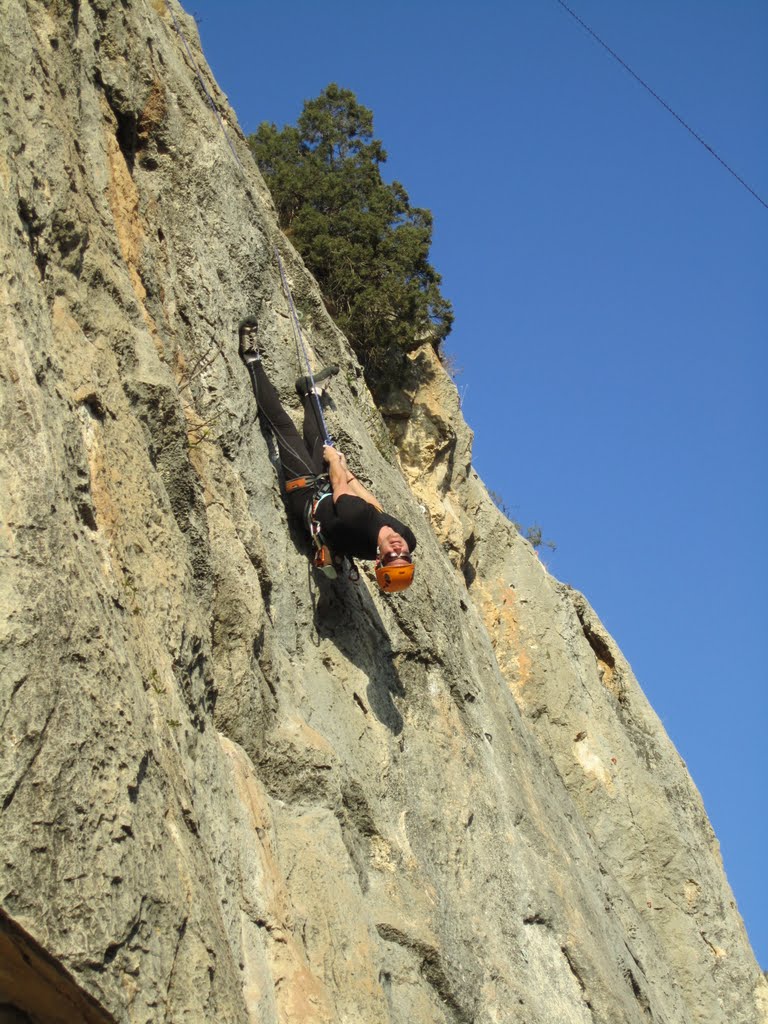 Paramos a comer por el camino y después nos despedimos, luego con Pilar nos fuimos a escalar un poco, habíamos quedado con Loren y Toño!!!, ahí me tenéis haciendo una vía de 35m de 6a en Olvena (Garra-pinillos Bajo), pero de segundo!!!